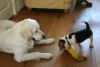 Een nieuw speeltje!!! Ze vindt het geweldig. Alleen de baasjes wat minder, want als ze het touw in haar mond neemt, dan fungeert de harde bal als sloopkogel en blijft er van het interieur alleen maar tandenstokers over. Maar even in de kast tot ze de bal zelf in haar mond kan nemen.